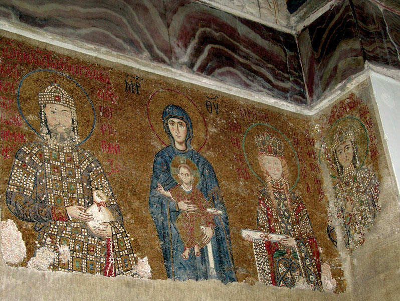 София Константинопольская » Богородица с предстоящими императором Иоанном II Комнином и императрицей Ириной и царевичем Алексеем. Южная галерея, 1122 г. Святая София Константинопольская.